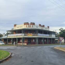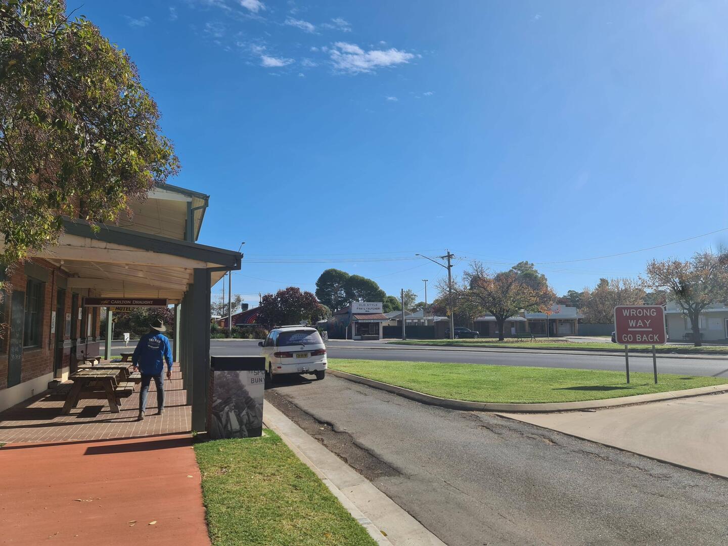 Come here and park ourselves in the camping area out the back of the Hotel. It is very neat and looks good. We go for a walk to the Hotel to see what we need to do to stay. It's shut.....on walking around the building, we find (I assume the owner or manager) working out the back - he tells us we're welcome to stay and that the Hotel opens for business at 4pm during the week - weekends it opens 11am. He is nice and friendly - quite happy to chat, we meet his dog Jasper (big mastiff type - lovely sook) and find out he used to work at the Altina Zoo (for 20 years). We leave him to his work, and go settle ourselves on our chosen site. Once set up (not much involved - still hitched to ute, no awning, no mat out) we have our lunch. Roger has a couple of meat and salad sandwiches, and I have a couple of open toasties - relish, avocado, tomato, salami, capsicum and cheese. Next, Roger goes for a walk across the road to the supermarket to get some mousetraps, I stay tidying up at the van. Once Roger's back - and set up his new traps in the back of the ute, we relax for the afternoon - reading our books. I do go for a short stroll to check out the town - it's a lovely small town, so I'm not gone for long. At 5.30pm we go over to the Hotel to have some drinks and get some tea. We both order Parmigianas - Rog's with salad and chips, mine with vegetables and mash. Good meals and nice company - chatting with fellow travellers. Quite a few customers in the pub tonight. When we've finished our meals, we come back to our caravan. Roger has a shower, I catch up our budget books. Now relaxing (I'm writing this up) before bed. As I head to bed, there is rain! Lovely sound to snuggle up in bed to.