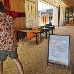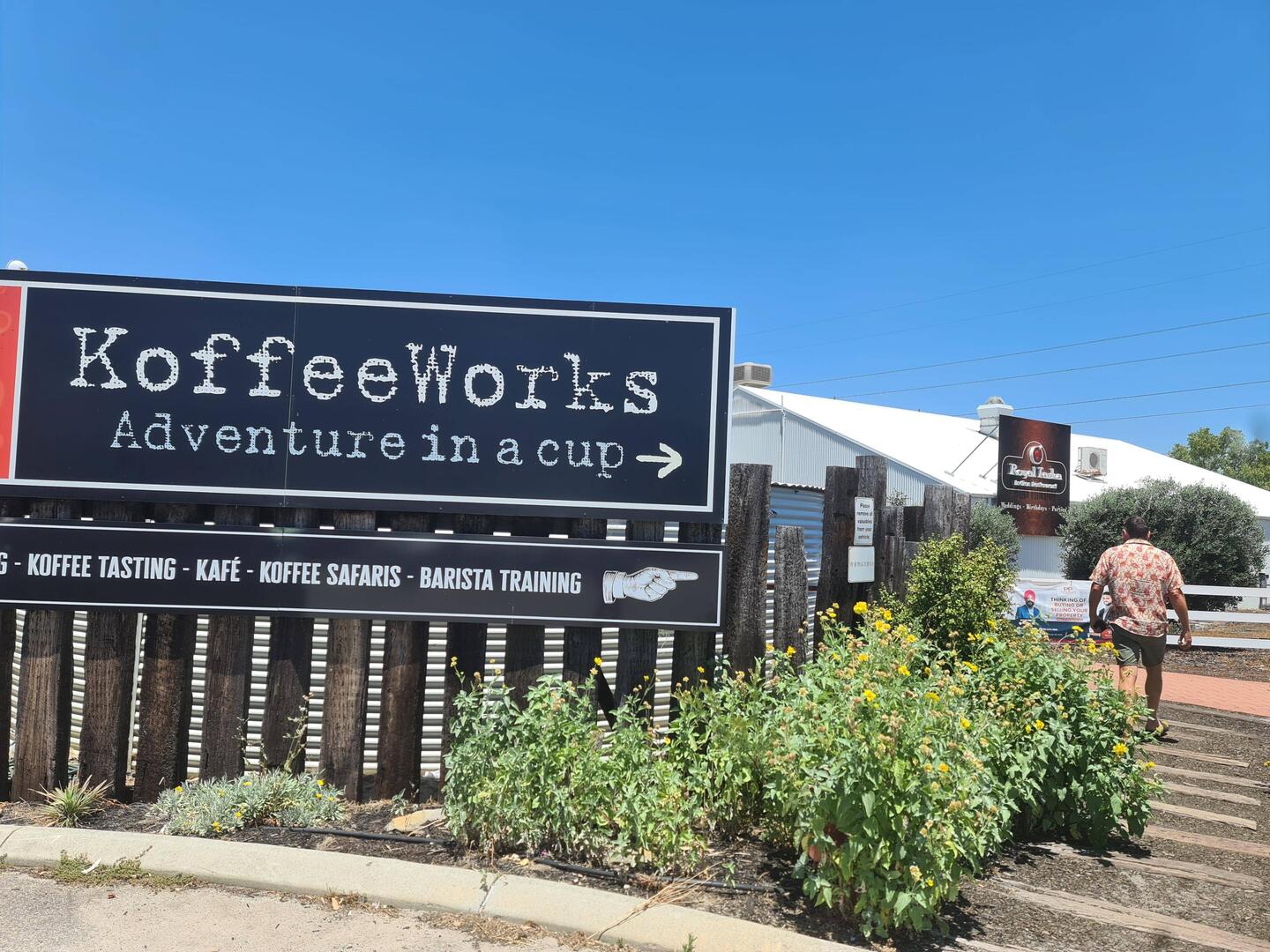 Our lunch stop today. Inside with air-conditioning and lovely coffee aromas. Pumpkin and corn fritters for me with an iced tea, Smashed Avocoda and cappuccino for Roger. Lovely.