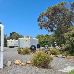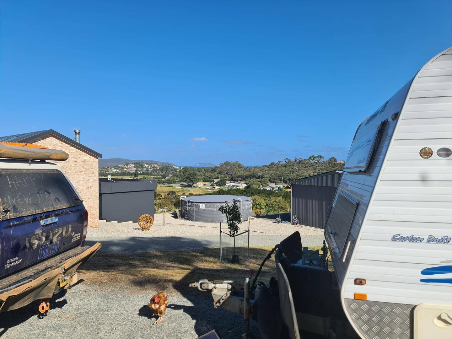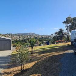 What a terrific spot, it's so convenient to Albany but feels 'rural' with great views out to the sea and to the town of Albury. Roger has been forewarned that he's required to back the van onto this property - he does in is usual 'no hassles' way. Ian, our host, comes out to greet us - very welcoming. Assures us we're settling where we should, and leaves us to it. Does say we're to come along later and help feed their animals if we feel like it.