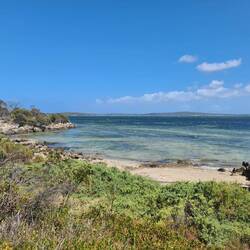 19/02/25 Wednesday We enjoy a lie in - nothing planned except to get to our next camping spot which isn't far away. So I stay in bed reading until after 8am, Roger got up around 7.45am to have his breakfast. I get up and have my breakfast too, then we go for a walk together along Cowleys Beach. Once we return I have a shower, then help get ready to leave here. We drive away just after 10am.
