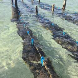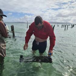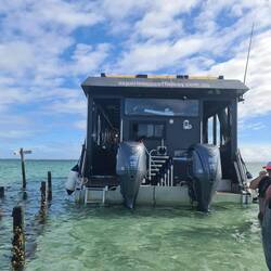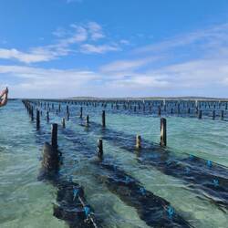 Have a great tour, fun to get out in the water - I chose the waders option, Rog just went for the swim option - for our wander in amongst the oyster racks. We then get to listen to Scott explain about current (and past) oyster practices - leading to todays sustainable farming. So much more involved than just waiting for them to grow! It takes 18 to 24 months to grow oysters to a size to be ready to be consumed. The premium oysters are 'fattened' to 3 years of age. After the talk, we all get a dozen fresh oysters each (shucked by Libby while the talk was happening) - served with fresh lemon and a couple of other sauce condiments. I tried them all, but definitely happy to have most natural - delicious! Now on our boat ride back to Coffin Bay Jetty we check out some places to see seals laying about resting on the rocks. Lovely tour.