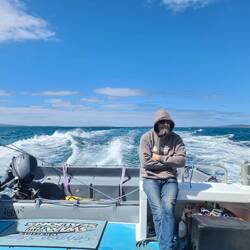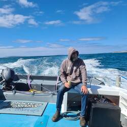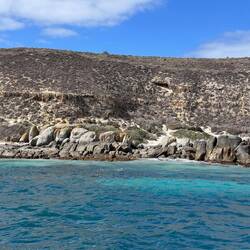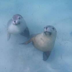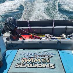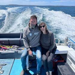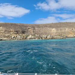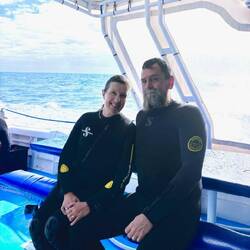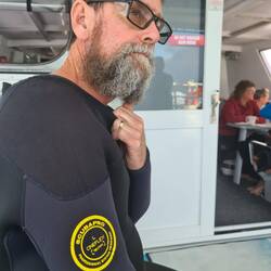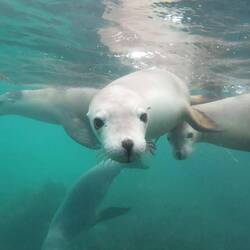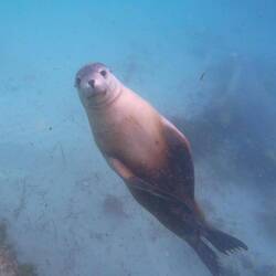 We all get aboard the boat just before 8am. The skipper, Andrew introduces himself and his crew, Bree, Bron and Chloe and explains how the tour will run. It is obviously a well organised set up. It will take us about an hour and half of boating to get us to our 1st option for the swim - in this time we'll be served (help ourselves to smorgasbord food) breakfast and we'll be kitted up in our wetsuits. The breakfast is great, ham and cheese toasted muffins and a platter of cut up fresh fruit. Getting into the provided wetsuits was accomplished with quite a few laughs - not the easiest things to get into for some of us! We arrive at the 1st option Grindor Island - decision is made that it's too shallow (tide) and choppy waters, so we go another 10 minutes to the 2nd option Hopkins Island - where we do our swim. We have 1 hour allowance to be in the water with the sealions - welcome to come back on board before that, or ride about in the tender boat with crew. I manage to stay out for around 45 minutes before returning to the boat, Roger isn't far behind me. Fantastic experience - those sealions are amazing and certainly happy to hang around and put on a good show (not trained, just inquisitive). We get out of the wetsuits and dry off - offer of hot showers but we're happy to just get dressed into our clothes again - we'll shower when we get back. Now we enjoy the hour and a half trip back, chatting happily and enjoying a couple of drinks. I'm chatting with a lady who turns out to be Andrea as well - she has kindly taken photos of Rog and I - and will forward them to us along with some photos and videos she has taken on today's tour. Had a great time with this tour.