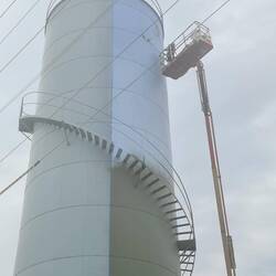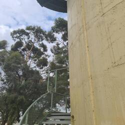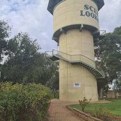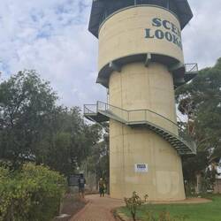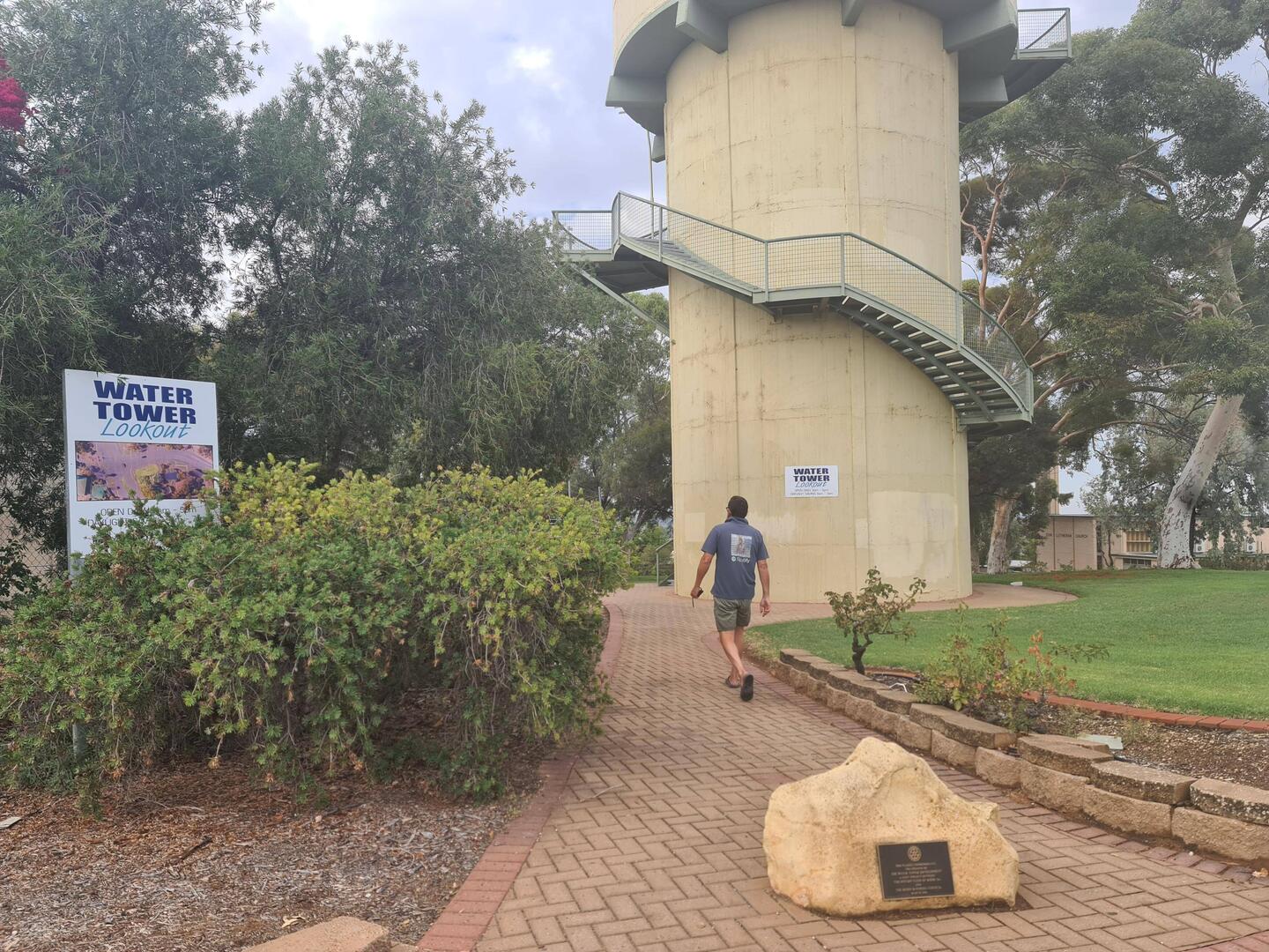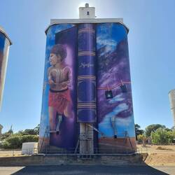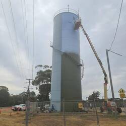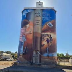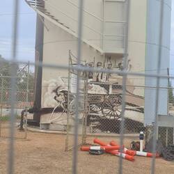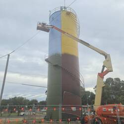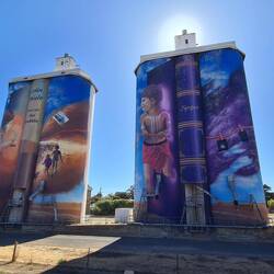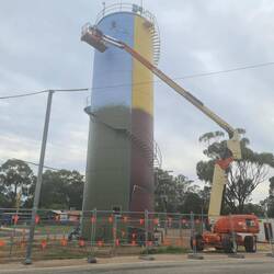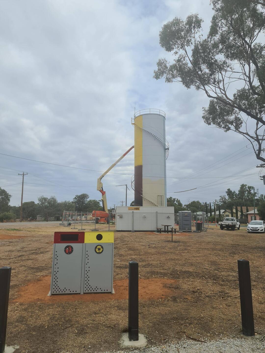 As we're leaving Moulamein, we come across its water tower and it's in the process of getting painted with murals. We stop so I can take some photos - the beforehand shots! On chatting with theLeia mais