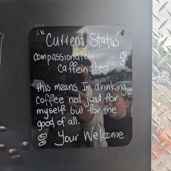 Der Kaffee brauchte 15 Minuten, weil die Maschine „noch aufwärmen“ müsse. Vermutlich ein Gerät, das schon warm war, als Neuseeland noch eine Kolonie war.