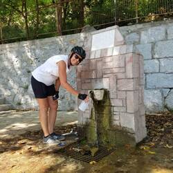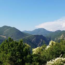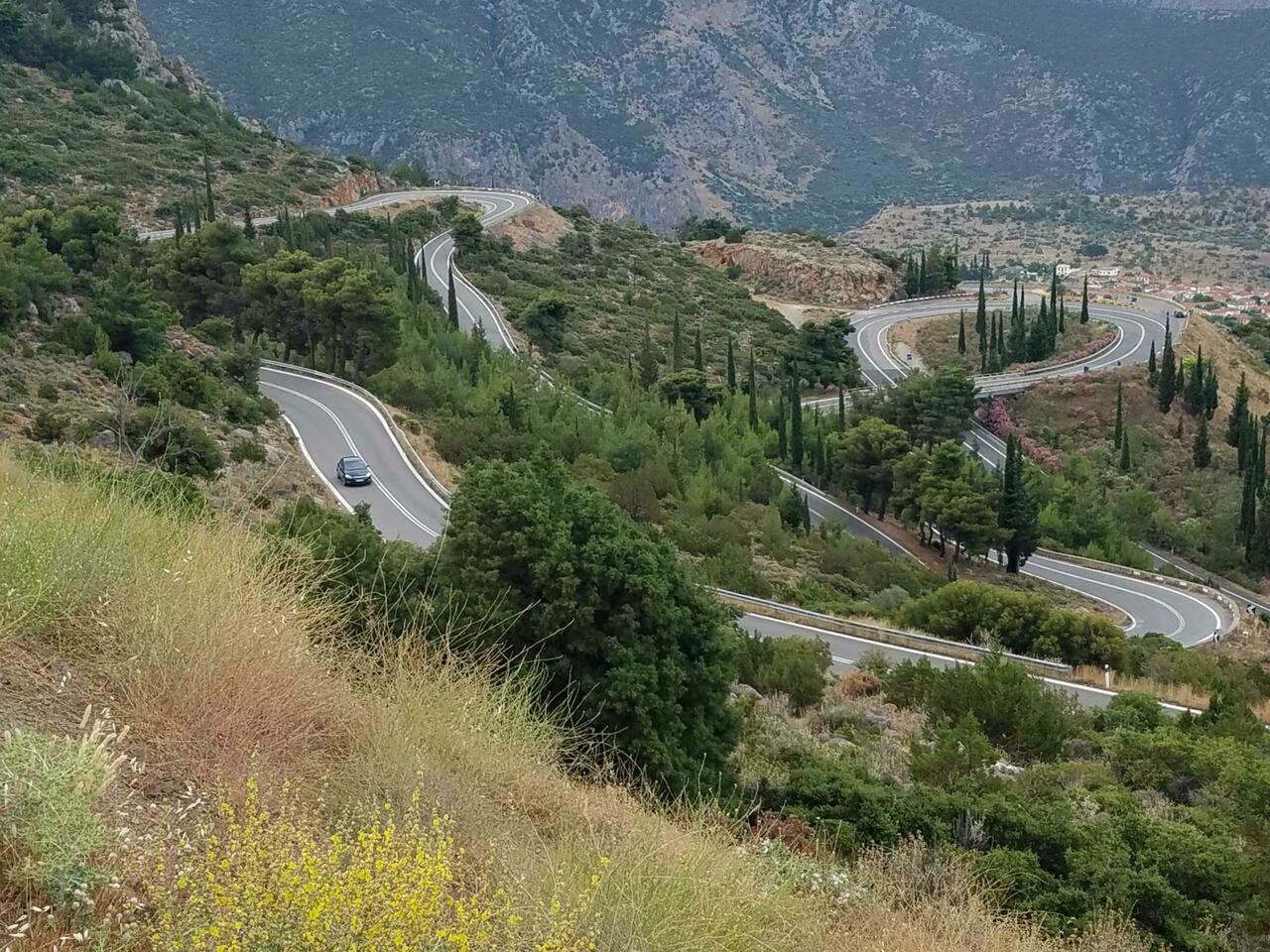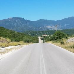 Big day in the mountains on country roads. We climbed two mountain passes: 48 miles, 4300 total elevation gain. Still hot but we are both feeling good and Susan's bike fits. Staying in AmfissaLeia mais