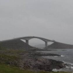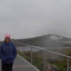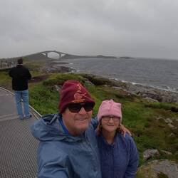After our visit to the church, we retraced our path along the Atlantic Road and stopped at one of its many scenic points. We took the opportunity to walk around a small island and catch a dramatic glimpse of the largest of the eight bridges—Storseisundet Bridge—a modern marvel of engineering that appears to leap into the sea. The weather, as it often does on the Atlantic coast, turned quickly. Fierce winds and cold rain returned just as we were finishing our walk. Thankfully, the warmth of our tour bus was only a few minutes away.