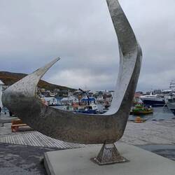 Down by the water, there’s a large modern metal sculpture. It looks like waves or sails and stands out against the fishing boats and mountains.