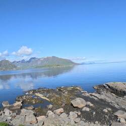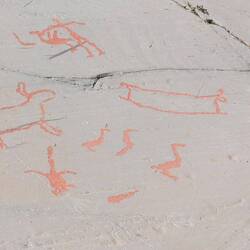 Walking the trails along the fjord, we viewed vivid red-outlined carvings of animals, hunters, boats, and life as it might have been 7,000 years ago. The setting was serene—smooth rock surfaces sloping toward the sea, backed by forest and mountains.
