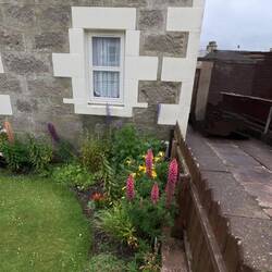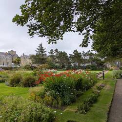 Further along, we discovered the village gardens, a riot of colour set against a backdrop of greys and greens. Meticulously kept flower beds overflowed with daisies, poppies, and marigolds, offering a joyful contrast to the brooding sky above. From here, we spotted historic school buildings and more of Lerwick’s signature granite homes, each with its own quiet story.