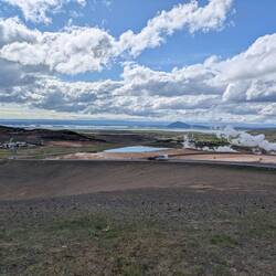 Just beyond, we paused for a photo stop overlooking the vast, glassy surface of Lake Mývatn. From this high vantage point, we could see the shimmering water framed by dark lava fields and distant volcanic peaks. In the foreground, plumes of steam rose from a geothermal energy plant — part of Iceland’s cutting-edge effort to harness the earth’s heat. Here, hot water and steam drawn from deep underground are converted into clean, renewable power, all while sitting on the edge of one of the country’s most beautiful natural lakes.