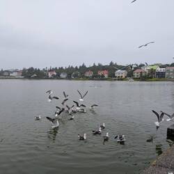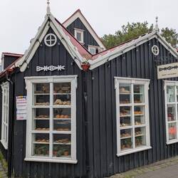 From there, we wandered into the city, weaving through charming art shops and galleries that lined the eY to the colorful Rainbow Street. The walk led us to the iconic Hallgrímskirkja Church, towering over the city skyline. Time for a pastry on our way to the church. Then exploring a few of the many souvenir shops nearby, we made our way downhill to the peaceful city pond, where ducks and geese added life to the calm setting.