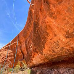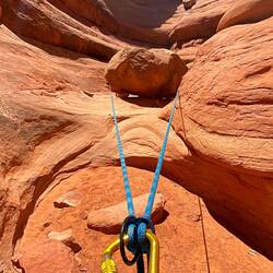 Gleich um die Ecke liegt der Ding-Dang Canyon. Nach kurzer Anfahrt durch ein ausgetrocknetes Flussbett sind wir hier jetzt wirklich alleine, denn dieser ist zwar weniger „slotisch“, dafür aber technischer. Das klingt nach Spaß. Also geht es zunächst den Ding-Canyon rauf. Die erste Wasserlochdurchquerung lässt nicht lange auf sich warten. Ab und zu eine kleine Klettereinlage- das fetzt. Am Ende des „Ding“ queren wir rüber zum Dang-Canyon und dann geht es diesen wieder hinunter. Die Kletterpassagen sind anspruchsvoller, deshalb liegen auch Fixseile, und die Wasserdurchquerungen noch etwas tiefer. Und da wir in der abgestanden Brühe nicht so scharf auf ein Bad sind, lösen wir das Problem ganz souverän mit Kaminklettern :-) Damit wäre der DingDang-Canyon in 3-4h erledigt.