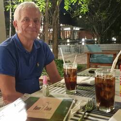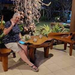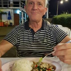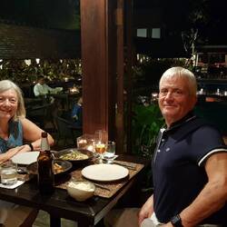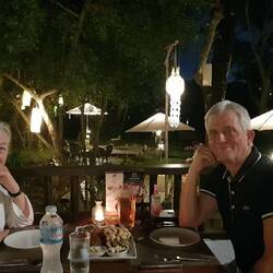 kind lady on a moped stopped and asked if we needed help. She put us right and we carried on over a large bridge to the Heritage Hotel on the other side of the river and enjoyed a beer on the riverside. For dinner we stopped at a local riverside eatery and had a lovely meal of chicken with rice and morning glory. We also did some people watching, observing that most of them came by car and what huge cars the Thais drive here!En savoir plus