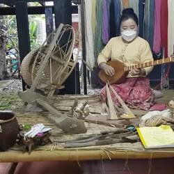 On our way back to our hotel, we stopped to visit a noble teak house in the city which has won architectural awards for the conservation of historical buildings. Here a lady explained how cotton was spun and woven and sang a song in the Lanna language to the sound of her phin, a local stringed instrument rather like a flute.