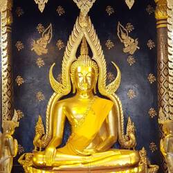 This temple is home to the Buddha image deemed the most beautiful in Thailand, the so-called Chinnarat Buddha. Nevertheless there were relatively few worshippers, so we were able to take our time and enjoy it. The temple is on the whole pretty photogenic, especially at this time of day.