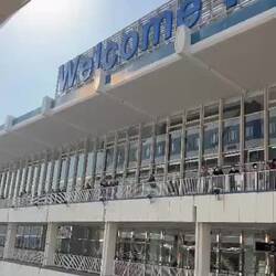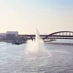 Bunte Fontänen im Wasser und eine Blaskapelle in Uniform spielt zum Empfang.Leggi altro