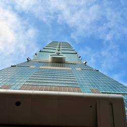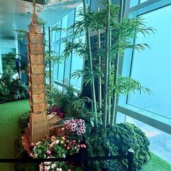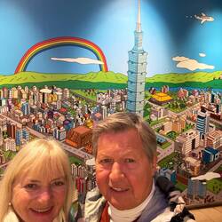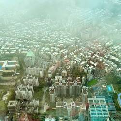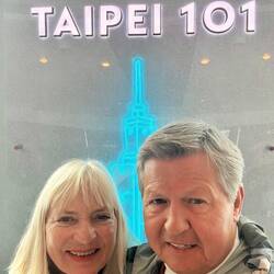 Nach dem verpflichtenden Identitätsabgleich für die Einreise nach Taiwan im Hafenterminal fahren wir 35 Minuten nach Taipeh zum Taipeh 101 mit 101 Stockwerken. Nach der rasanten geräuschlosen Fahrstuhlfahrt nach oben erwartet uns ein fantastischer Blick auf die Hauptstadt. Leider sind noch kleine Nebelschwaden vorhanden, sodass es etwas diesig ist. Oben sind verschiedene Bereiche mit echten und unechten Pflanzen, Bambus und geschichtlichen Figuren dekoriert.