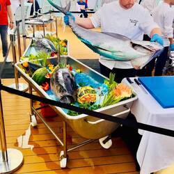 Bei 18 Grad und ☀️ endlich mal wieder Poolbrunch auf Deck 12 mit „ Golden Jade Dragon „ und Lillet Sprizz 🥂🥂. Die frischen riesigen Thunfische werden vor unseren Augen zubereitet und schmecken köstlich! 🤪