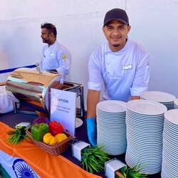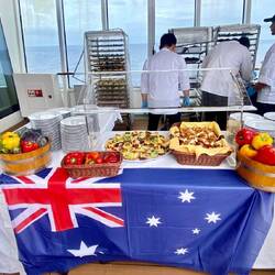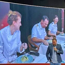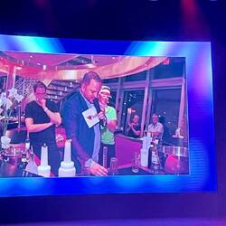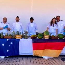 Der F& B Direktor moderiert den sehr lustigen Abend mit tollen Sprüchen. Es dampft und riecht lecker, dann wieder verbrannt! Das TV Team filmt diese Show und zeigt alles zeitgleich auf der großen LED Wand.