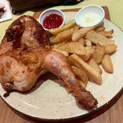 Zur Stärkung werden Hähnchen mit Pommes serviert.