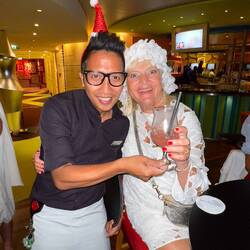 Um 11.15 Uhr sind alle Gäste zum Farewell Sektbuffet im Theater eingeladen. Hunderte von buntgefüllten Sektgläsern stehen dekoriert im Theater und man erkennt unsere Reiseroute! Welch ein Arbeit und besonders schön anzusehen!