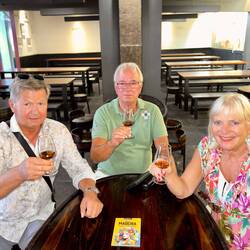 Wir schnappen uns morgens ein Taxi zu viert und fahren zu einem kleinen idyllischen Fischerort und weiter zum Skywalk ! Eine Glasplattform in 580 m Höhe mit einem atemberaubenden Ausblick. 👀 Wir trauen uns auf die Plattform …. Yeah ! Wir besuchen die 3. Christusstatue und fahren zur Blandy‘s Destillerie und probieren mehrmals (!) den sehr köstlichen Madeirawein. Es ist eine Mischung aus Portwein mit Brandy versetzt und er wird bei 30 Grad in Holzfässern über lange Jahre gereift und ist unbegrenzt haltbar ( natürlich vor dem Öffnen)!!! 🤪 Man kann die Flasche aus seinem Geburtsjahr kaufen! Je älter man ist …. je teurer die Flasche 🥵