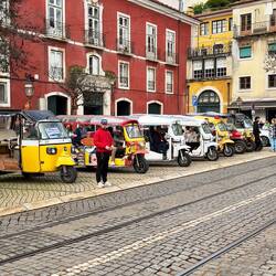 Wir treffen uns um 9.30 Uhr und besteigen ein Tuk Tuk ( siehe Foto ) und fahren damit stundenlang durch die vielen schmalen Gassen von einem Höhepunkt wie Kirchen, Aussichtspunkten und Kaffeeshops hoch und runter. Unser deutschsprachiger Fahrer erzählt ausführlich (!) die Geschichte von Lissabon und erklärt alle Sehenswürdigkeiten sehr genau. Viele verschiedene Tuk Tuks fahren kreuz und quer durch Lissabon!