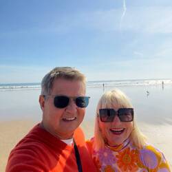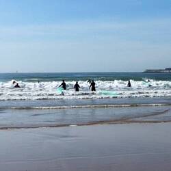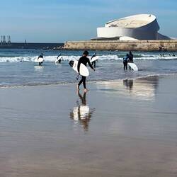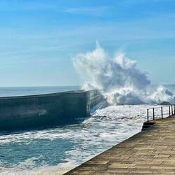 Am langen breiten hellen Sandstrand bewundern wir die vielen Wellenreiter, die gekonnt auf den hohen Wellen Ihre Kunststücke zeigen oder auch nicht ! 🥵
