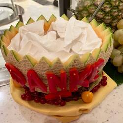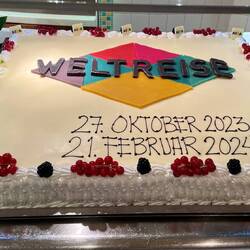 Mit einer kulinarischen Überraschung erfreut uns das Küchen Team. Eine Weltreisetorte, so liebevoll und kunstvoll dekoriert und jeder Gast bekommt ein Stück der leckeren Torte 🎂!