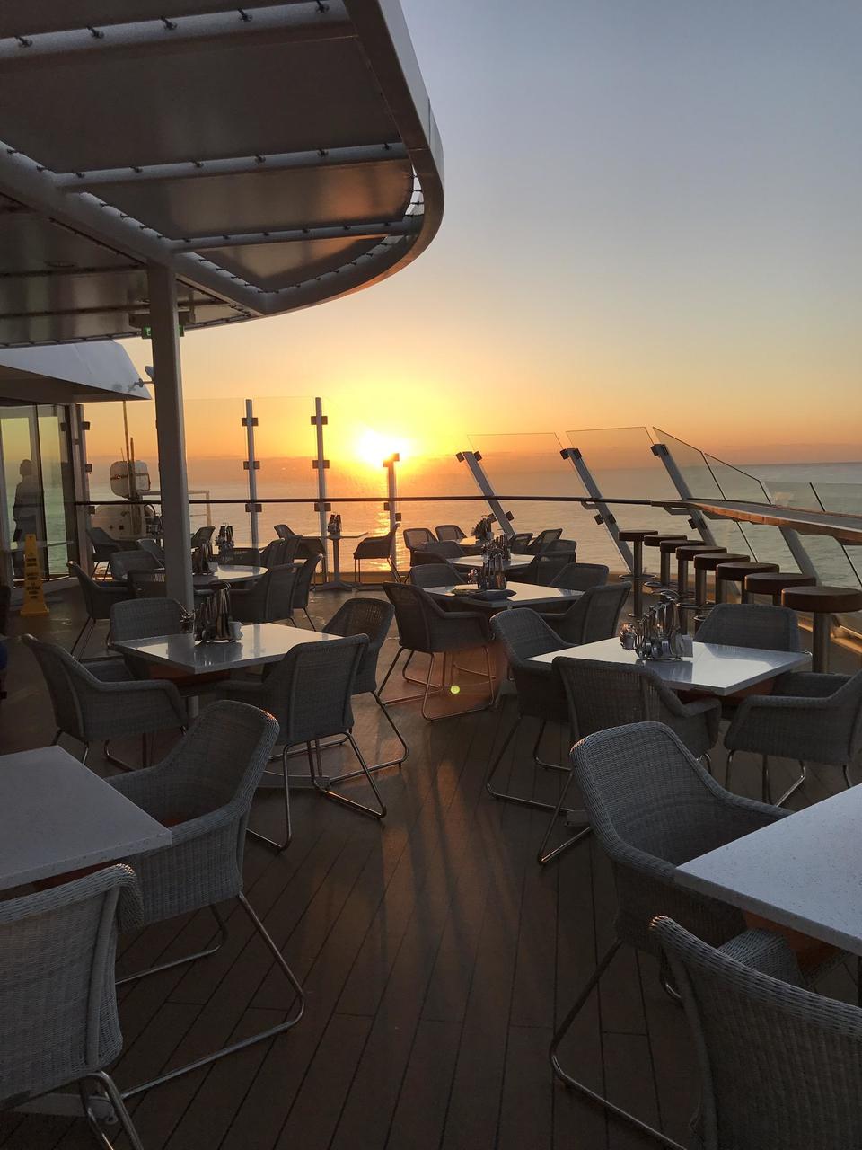 Leinen fest: 7:24 Uhr. Ich genieße den Sonnenaufgang auf der Frühstücksterrasse hinten im Gosch.