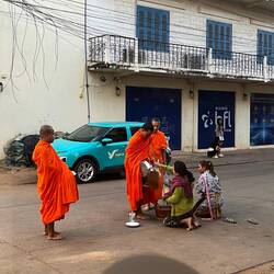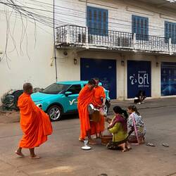Sem čisto slučajno ujela alms giving ceremony, pred hostlom sta dve gospe čakali mlade menihe, da so prišli po njune daritve. Iz košar sta jim podarili riž in nekakšne omake v plastiki, potem sta nekaj zmolili in oni so odšli. Bila sem cela zalimana ampak vesela, da sem ujela to v preprostosti vsakodnevnega običaja lokalcev🙏. V Luang Prabangu so to namreč imeli kot veliko turistično atrakcijo, po 200+turistov vsako jutro okoli enega templja.
