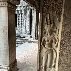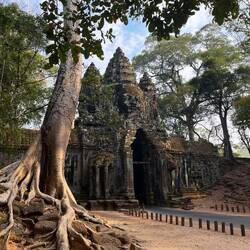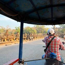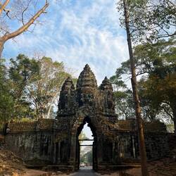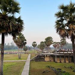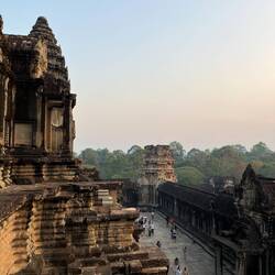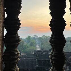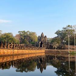Kan naju je odložil pred jezerom, čez katerega vodi most proti Ankor Watu, največjem in najbolj slavnem od vseh templjev v kompleksu. Z gručo ostalih turistov sva se ob jutranjih barvah neba šetkali naokoli in občudovali tele zgradbe. Dejanski vzhod ni bil osupljiv zaradi oblakov, je bilo pa še vedno res unikatno se med jutranjimi meglicami sprehajat po takšni zgodovinski zgradbi🫨.