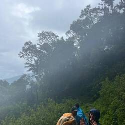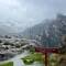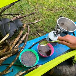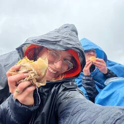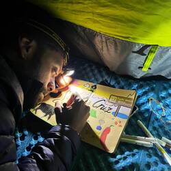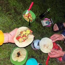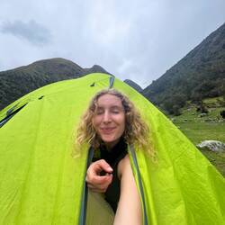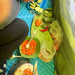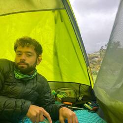 Zmatrani kooončno prispemo do kampinga, ravno ko začne mal deževat 🌧️. Uspešno zelo hitro uspemo postavit šotore in se zlekniti notri, preden začne bolj nalivat…