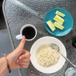Ustanemo zgodaj, okrog pol šestih in si z zalimanimi učki skuhamo zajtrk, ovseneLes mer