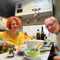 Zmatrani se umaknemo v senco, spijemo kofe in potem se jaz lotim priprave kosila. En večer prej sem namočila čičeriko in zdaj jo dam še kuhat, v drugi kastroli skuham riž, v tretji podušim malo zelenjave.