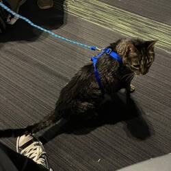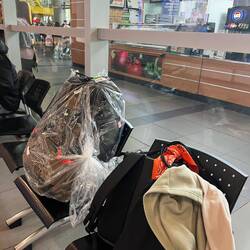 Ko čakam na boarding ima par nasproti mene eno zanimivo prtljago. Odpre kuferček in ven prikupen muc! Pride do mene, me povoha, jaz ga malo počoham in mi povejo da je zelo star in slep, a kljub temu super in potrpežljiv popotnik!