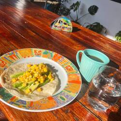 Zjutraj si za zajtrk naredimo ovsene kosmiče s peanut butterjem (ki sem ga jaz privlekla iz Medellina) in kavico za štart dneva!