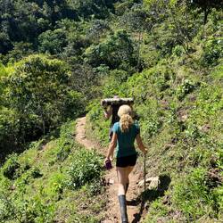Pobere me en najstnik, najbrž ene 14 let star, me pobaše na njegov motorček in šibava… matr, kam rinemo🙈 najprej malo ob vodi in potem potka odvije strmo po blatnem pobočju, polna ovinkov, ki izgledajo od odzadaj nemogoči za odpeljat… kaj šele z eno štorasto turistko in njenim ogromnim ruzakom zadaj😅. Ampak valda to lokalni fantje obvladajo.