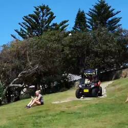 Sonntag morgen. Auf unserer Terrasse und auch bei den Nachbarn ist ein gesunder Abstand untereinander garantiert. Der Strand ist abgesperrt, aber was für ein Mobil fährt da über die Wiesen? WerdenLeia mais