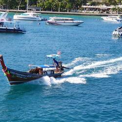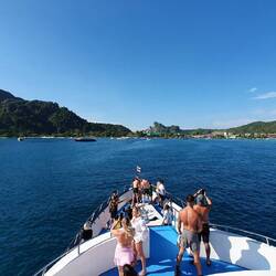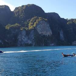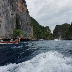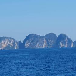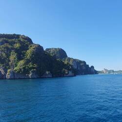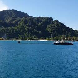 Eine 2-stündige Bootsfahrt bringt uns bei beinahe Windstille in den sicheren Hafen von PHI PHI.