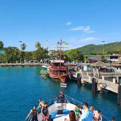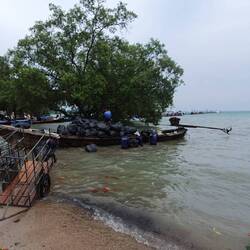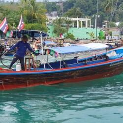 In LAEM KRUHD müssen wir unerwartet umsteigen. Wann das nächste Wasserfahrzeug kommt ist noch ungewiss. Wir bitten das Personal am Pier zu prüfen, ob nicht doch ein Boot bis AO NANG fährt. Nach langen Telefonaten ist tatsächlich ein nächster Dampfer gefunden.