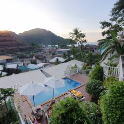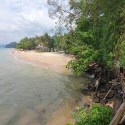 An wackligen Bambusgeländern und unregelmäßigen Holztreppen erklimmen wir eine Anhöhe um gleich wieder zum PHAI PLONG BEACH ab zusteigen. Was für ein spektakuläre Aussicht auf eine kleine Bucht mit einer exklusiven Hotelanlage. Hier verbringen wir den Tag, das Meer ist gefühlt etwas wärmer als bei der Insel KO LANTA, etwa 26 Grad...