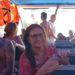 Wieder zurück am Pier steht Dagmar mit unseren Rucksäcken bereits am Boot.
