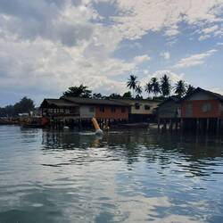 Dann ist Zeit das Pfahldorf zu entdecken. Die hier lebenden muslimischen Meereszigeuner haben sich sehr bescheidene Hütten aus Holz und Wellblech errichtet. Es gibt Strom und Leitungswasser, auch eine Schule und ein schwimmendes Fußballfeld. Alles überragt aber eine Moschee, ein Bild wie aus einem anderen Film...