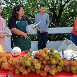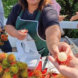 Schulkinder in ihrer Mittagspause winken uns zu, an einem Stand werden uns RAMBUTAN-Früchte zum Probieren angeboten, sehr leckeres 😋 Fruchtfleisch!