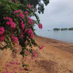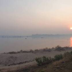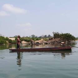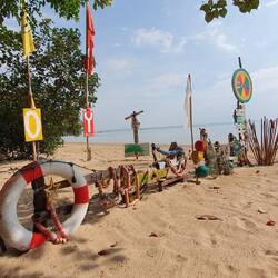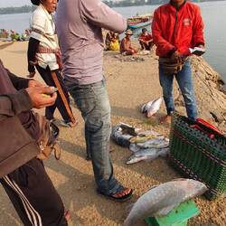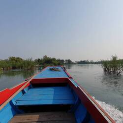 Wir können die Fischer in ihren kleinen Holzbooten beobachten, an unserem "Strand" ruhen Wasserbüffel, nur das Aneinanderstoßen der Hörner ist für uns eine neue Abendmusik.