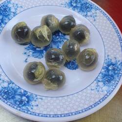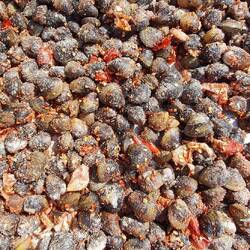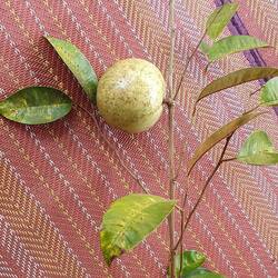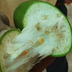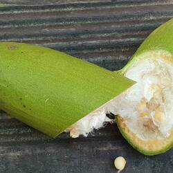 Die Früchte sind etwa stachelbeergroß, unter der schützenden grünen Schale befindet sich ein schleimiger ovaler "Augapfel". Dieses süße Fruchtfleisch mit einem schwarzen Kern erinnert erschreckend an ein trauriges Ziegenauge. Schmeckt aber lecker!