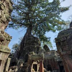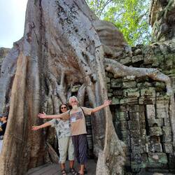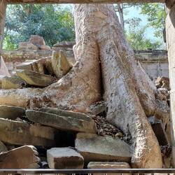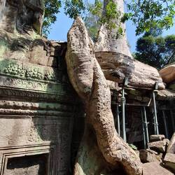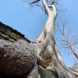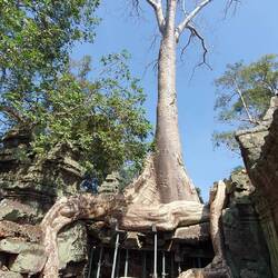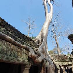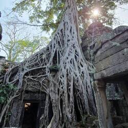 Noch am Vormittag erreichen wir dank TukTukTuk ein nächstes Highlight. KLAT ROUS hat diesen Tempel mit Bedacht ausgewählt, denn Ficus-Baumriesen beschatten unser Dasein unter der unbarmherzigen Mittagssonne hervorragend.