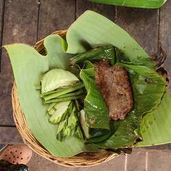 Eine Autofähre bringt uns über denTONIE SAN River, JAMMY spendiert uns in Bananenblättern gegrillte Bananen🍌 gefüllt mit Sticky-Reis. Sowas von lecker!