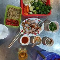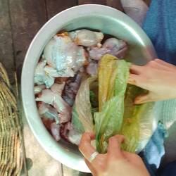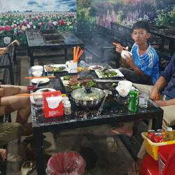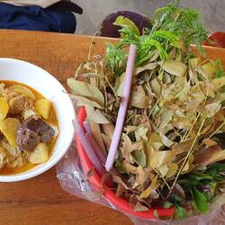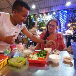 Dagmar wählt eine rötliche Suppe mit u. a. Kartoffeln und Schweineblutstückchen. Frische Kräuter aus einem Körbchen kann sich jeder selbst zupfen. Sehr zu empfehlen die Stiele der rosa Lotusblume,weil in einer Suppe, sehr knackig und dann nicht mehr geschmacksneutral.